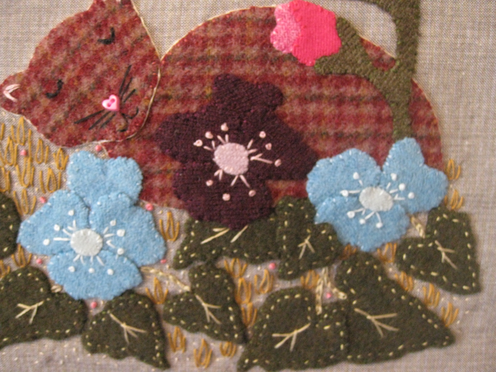 The cat is doing pretty much what I’ve wanted to do every day! I used bull head stitches for the ground cover, with French knots and small stitches sprinkled everywhere; straight stitches and French knots on the flowers, stem stitch on the bud leaves; back stitch on the bee… I think that is it.