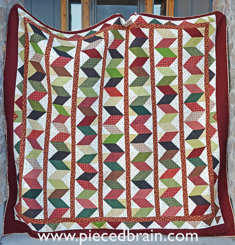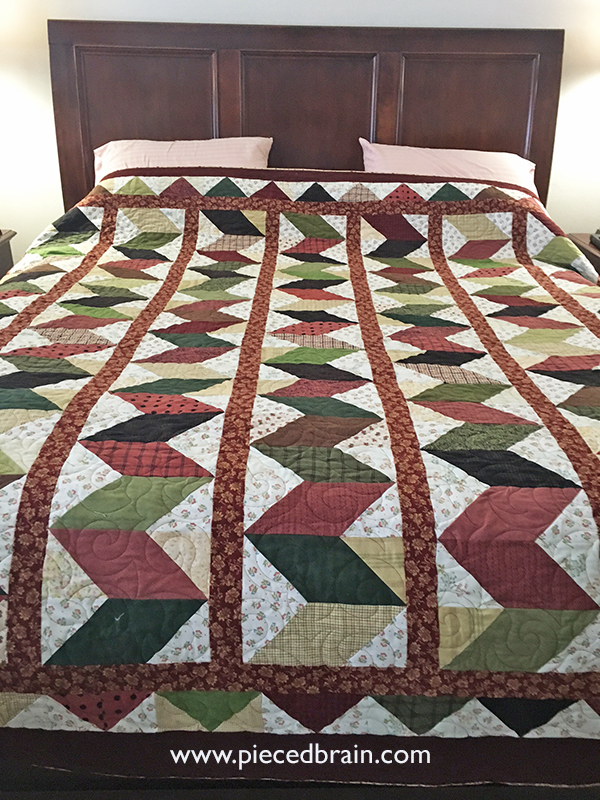 This king size quilt is finally finished! The pattern is called Crooked Path (fat quarter friendly!) from the book “Oh Sew Cozy Flannel Quilts” by Lynette Jensen (I found it here). Click here to see my original post when I was getting ready to begin this project. The quilt top was pieced very fast but remained folded inside the closet in my quilt studio for more than two years, awaiting my courage to quilt it in my Bernina. It never happened. Two months ago I made the smart decision to send it to a long arm quilter.