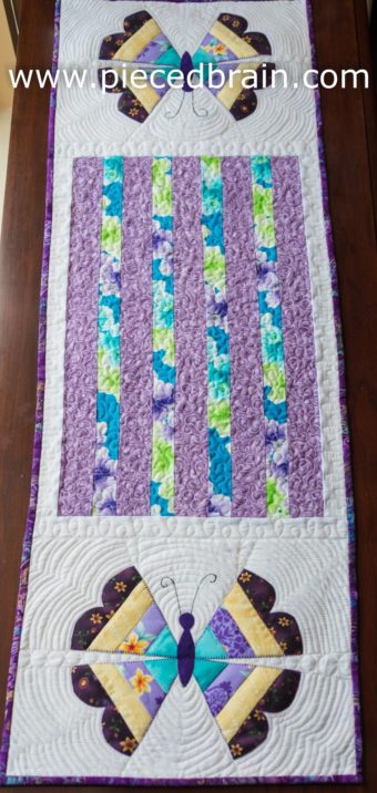 A few more strips out of my scrap drawer! I started by sewing together the four strips which I used for the butterfly. Then, I could not think of anything to do with that little strata. I cut it in rectangles... Nothing. Instead of thinking 'blocks', I started thinking 'shapes'. That is when I thought of butterfly wings. I traced triangles onto Heat'nBond paper, ironed them onto the back of the strippy rectangles, pulled the paper off and used scissors to shape the edges of the wings. I … [Read more...] about Strip-easy Table Runner
