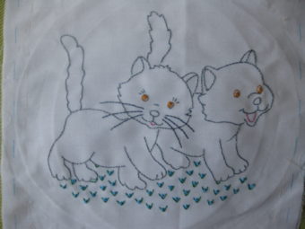 The kittens are done! I added some grass and flowers to the block... I mixed two strands of DMC floss - dark gray and almost silver for the kittens, amber for the eyes, dark gray for the whiskers. Here are the other blocks I've done so far: giraffes and puppies, elephants, pigs, horses and snakes. French knots are so much easier to make when one uses a hoop... Depending on the work I will not use it, as when working with wool or photographs. I will probably complete two or more blocks this … [Read more...] about One more embroidery block finished!