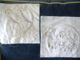 My grandson is already 2 months old and I am still working on his second quilt... Last night I finished the giraffes and today I completed the puppies. I did not have a chance to iron them before I took the picture, thus the hoop marks. There are 7 more blocks to go, then I will use fabrics from the Two by Two collection by Henry Glass (2012) for sashing, borders, and backing. It will look so cute when it is done... perhaps by Christmas, at the rate I am going! Here are some of the fabrics I … [Read more...] about Embroidery coming along