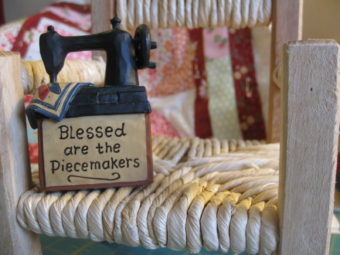 This tiny sewing machine sits on my cutting table. I love being a piecemaker... So many people have my sewing machine to thank for being alive, and they don't even know it!!! :-) I have a few other things on my table: a porcelain cat holding a mouse in his mouth, a family of frogs, cartoons I clipped from the newspaper, a frog hanging from the lamp... All "essential" nick nacks which enhance the ambiance. How about you? Is there something special in your studio that summarizes how you … [Read more...] about Blessed are the piecemakers