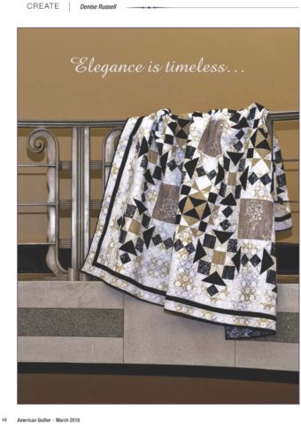 Photo by American Quilter. Used with permission. Happy Tuesday, everyone! I can finally show you my pattern Timeless Elegance which has just been published in the March issue of the American Quilter magazine. This quilt measures 77" square with 12" blocks. I chose amazing fabrics from the Zephyr collection designed by Alice Kennedy for Timeless Treasures: These aren't all the fabrics I used but they give you an idea of why I called the pattern Timeless … [Read more...] about Black and Gold quilt