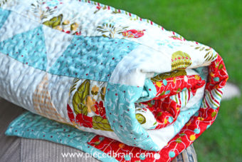 Last Fall, my friends Deb, Lisa, and I started a small round robin. We each made a quilt block (or a quilt center) and took turns adding borders to it. This is how my quilt turned out - don't you love these prints in the Holly's Tree Farm fabric line by Moda Fabrics? (My favorite quilt holder is not around much now that school started, so a bench will have to do...). This square table topper measures 33-1/2". Lisa added the first few borders: blue print with flying geese, cute … [Read more...] about Christmas Table Topper