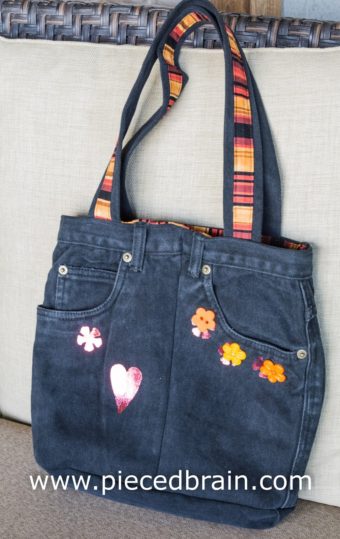 How about a Christmas gift, instead of ornament or wall hanging, for a change of pace? I had started this bag many years ago and never finished it. When I started working with Deco-Foils (by Therm-O-Web) I remembered this project and thought this would be a great opportunity to finish it. Oh, I like how it turned out! The lining is of the same fabric as the decoration on the handles. I kept all the pockets from the pants in place and made sure I did not stitch over them so they are … [Read more...] about Upcycled Jeans Bag