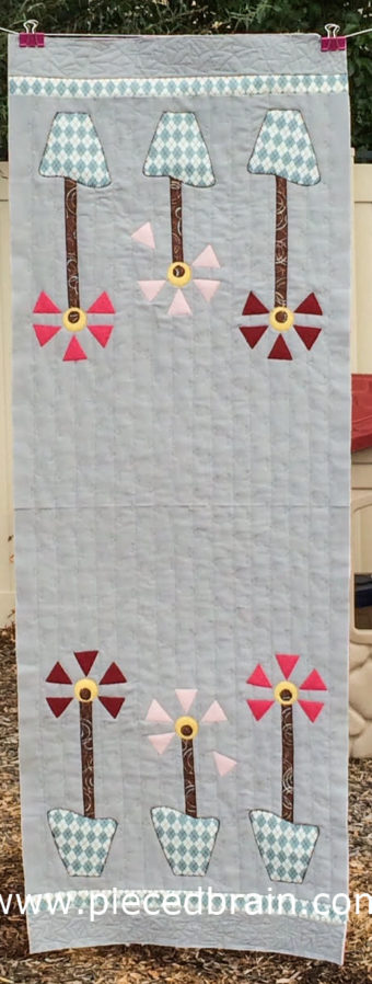 I am having a difficult time finding binding fabric for this table runner (not good day for pictures)! I have a bunch of gray fabrics, none work. I ran out of the gray I used on the runner as that would have been an easy solution. I went out and got some fabric that I thought would work, got home and did not like the combination. Ai, ai, ai... The idea for this table runner came from a quilt I made a while ago (see it here), minus the embroidery. The flowers were fused with HeatnBond Lite … [Read more...] about Triangle Table Runner