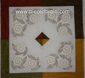 I am still trying to figure out what to do next on this table top. I wish I had chosen cream or beige instead of white, but that is history now. Fall is here and the fabrics where already on my cutting table from another project... I did not want to work with applique, so I decided to embroider the leafy motif. For each of the white blocks, I marked the swirl and the three leaves, and placed batting on the back. Then, using Aurifil 28wt and Aurifil 50wt for the swirl, I began to free motion … [Read more...] about Tiny, tiny freemotion embroidering