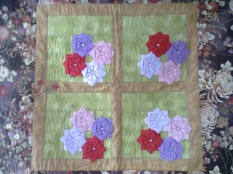 Check out this wall hanging I made with 3-D flowers. I took this class in Annapolis, Maryland, and really loved it. The pattern can be found in Rebecca Wat's book Fantastic Fabric Folding. If you enjoy adding 3-D elements to your quilted projects, this is a great book for your library. Her flowers are easy to make, and she provides step-by-step photographs to help with each one. All the projects featured in the book are gorgeous! I have added these same flowers to a table runner, which turned … [Read more...] about Three Dimensional Flowers