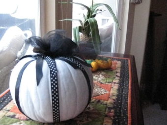 My friend Celeste and her daughter brought over this awesome pumpkin the other day. I love how they decorated with black and white ribbon - against the white paint. The black tulle ribbon on the stem completes the look. Today I am calling it 'snow pumpkin' because, if you notice on the left side of the picture, we got two inches of snow yesterday (see next picture). No fair! This is still October!!! Sapphire the cat went out on the deck for less than a minute this morning, curious about the … [Read more...] about Snow pumpkin?